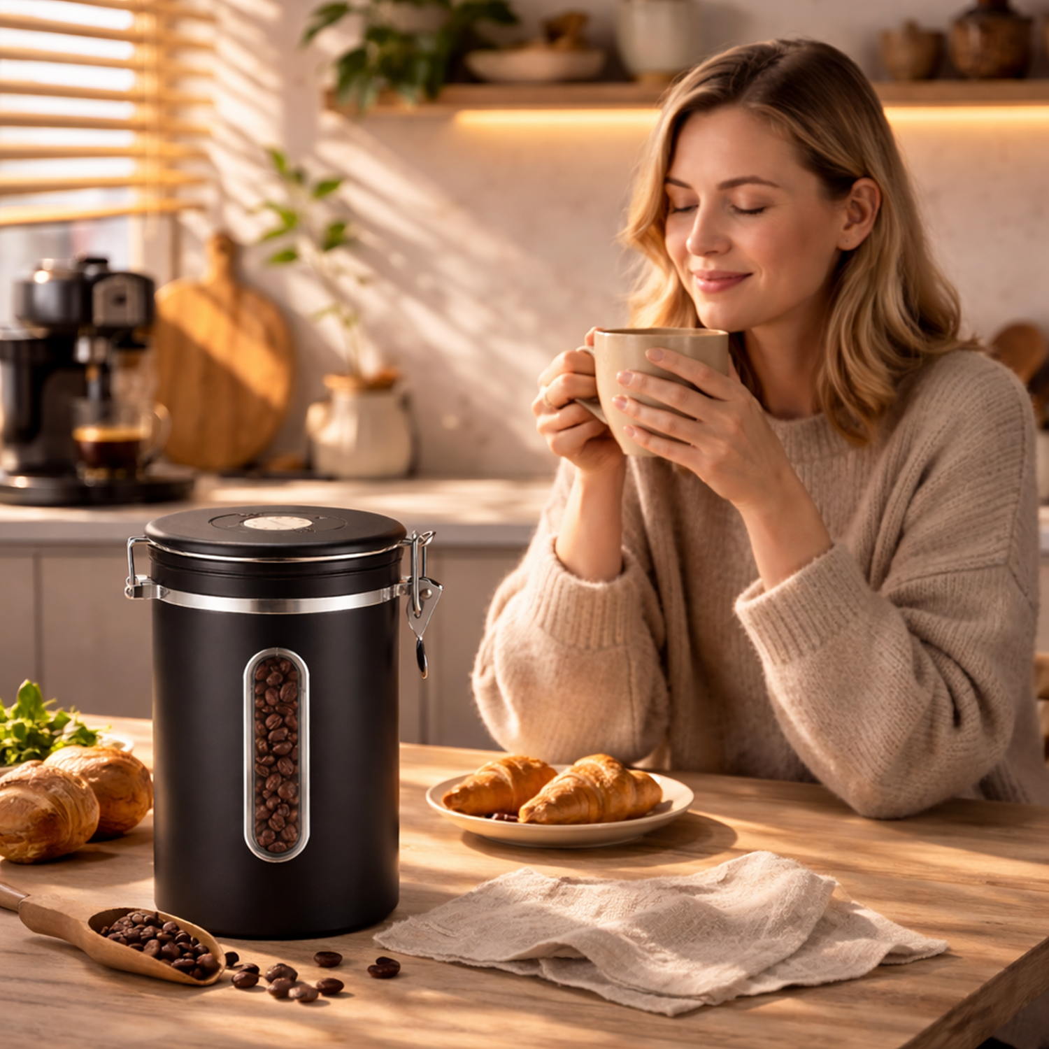 Morning sunlight on the counter. The soft hum of the kettle. The aroma of coffee in the air.